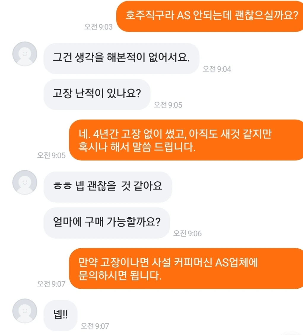 당근에 팔만한 커피 기물들을 정리해 본다. 커피를 좋아하는 사람이라면, 갖고는 싶지만 비싸서 사지 못했던 물건, 중고로 저렴하게 사고 싶은 물건이란 기준을 세웠다. 1순위로 '에스프레소 머신'을 골랐다. 물건 상태를 꼼꼼히 체크하고, 중고 거래 시세도 알아본다. 내가 살 때나, 지금이나 이 물건은 인기가 많았다. 가격도 나쁘지 않았다. 사진을 찍어 당근에 올린다. 인기 좋고, 상태도 좋은 물건이라 바로 2건의 채팅 알람이 온다. 전압과 A/S에 대해 묻는 채팅이다.
