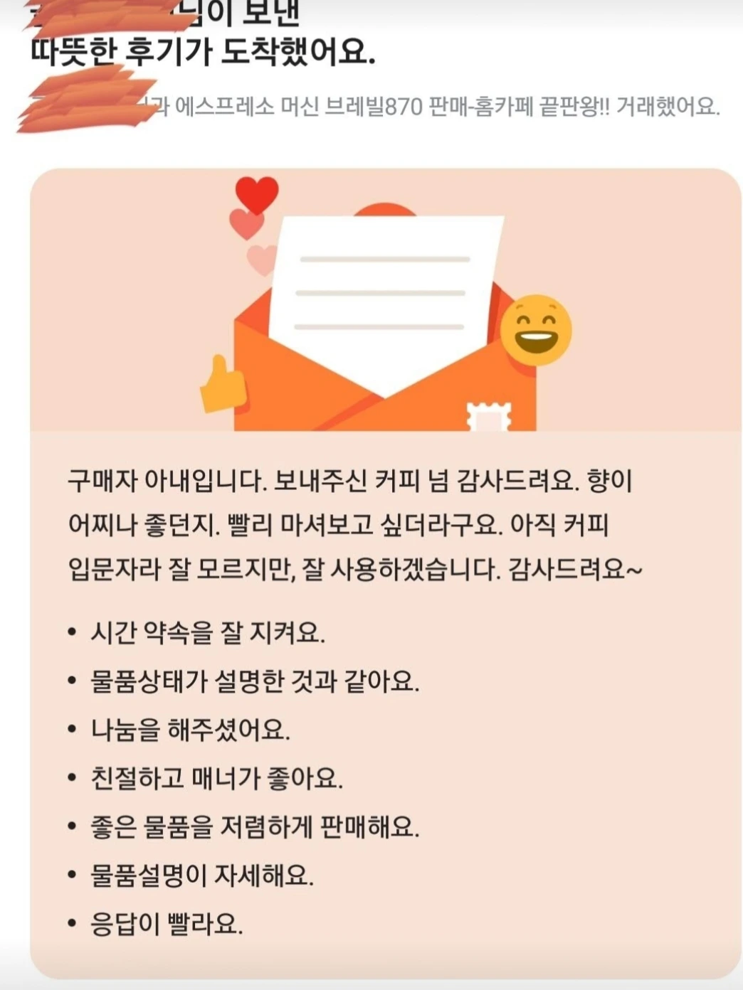 거래후기, 구매자 아내분이 남긴 글