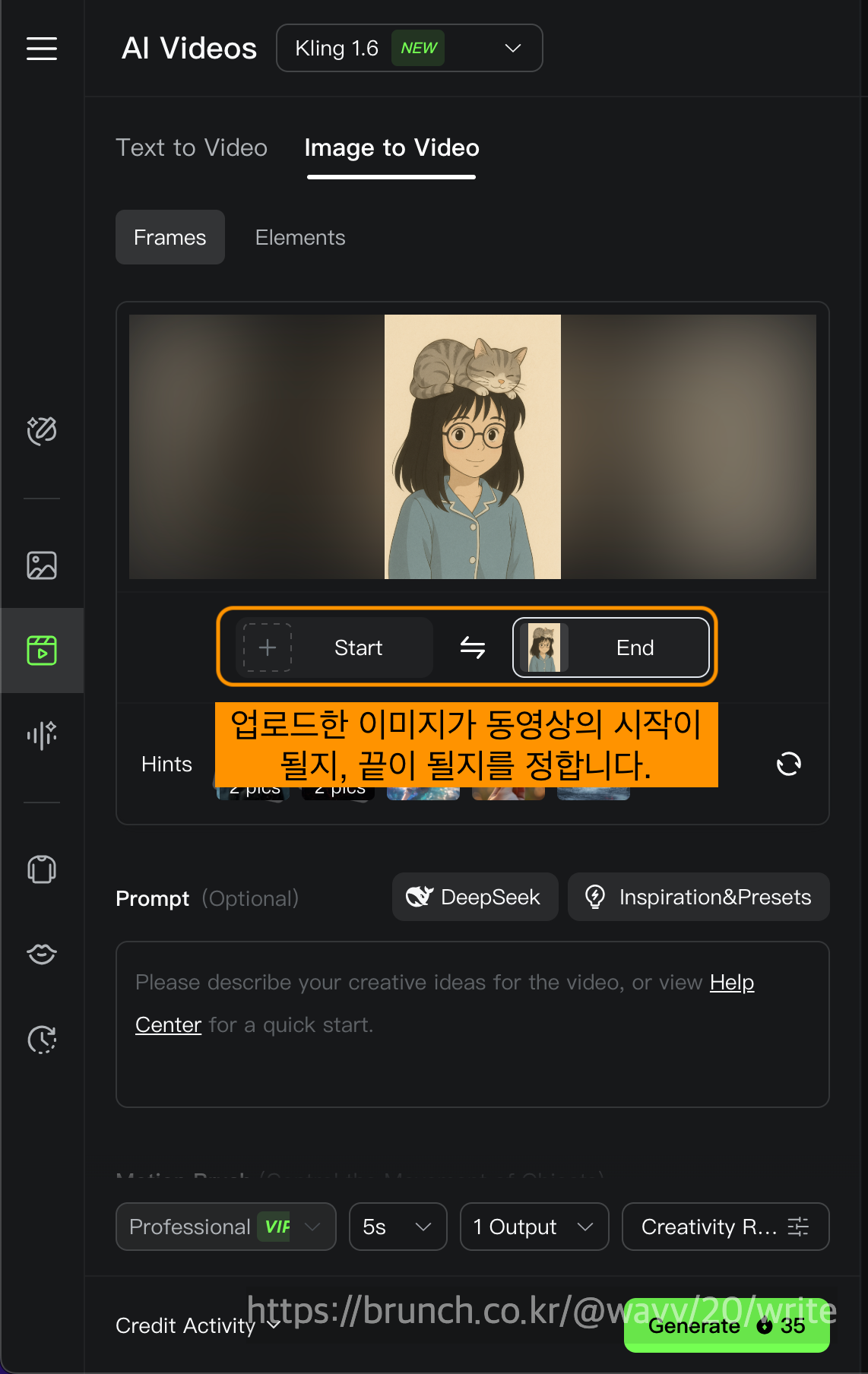 저는 고양이가 머리에 올라가 있는 지브리풍 이미지를 준비했는데, 영상 앞부분에 고양이가 어깨를 타고 올라오는 부분은 생성해서 시작하고, 끝부분(end)을 제가 생성해둔 지브리 이미지로 하고 싶어서 'End'에 이미지를 넣었습니다(맨 아랫쪽의 완성 영상을 보시면 더 쉽게 이해되실 겁니다).