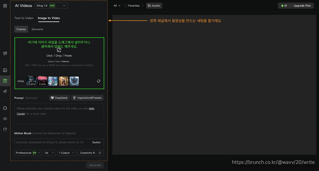AI Video 페이지가 뜨면서, 아래와 같은 UI가 나오는데 동영상 제작을 위한 세팅은 왼쪽 패널을 통해서 진행하면 됩니다. 초록색 영역을 눌러서 준비하신 지브리 이미지를 불러와주세요. (클릭 두 번!)