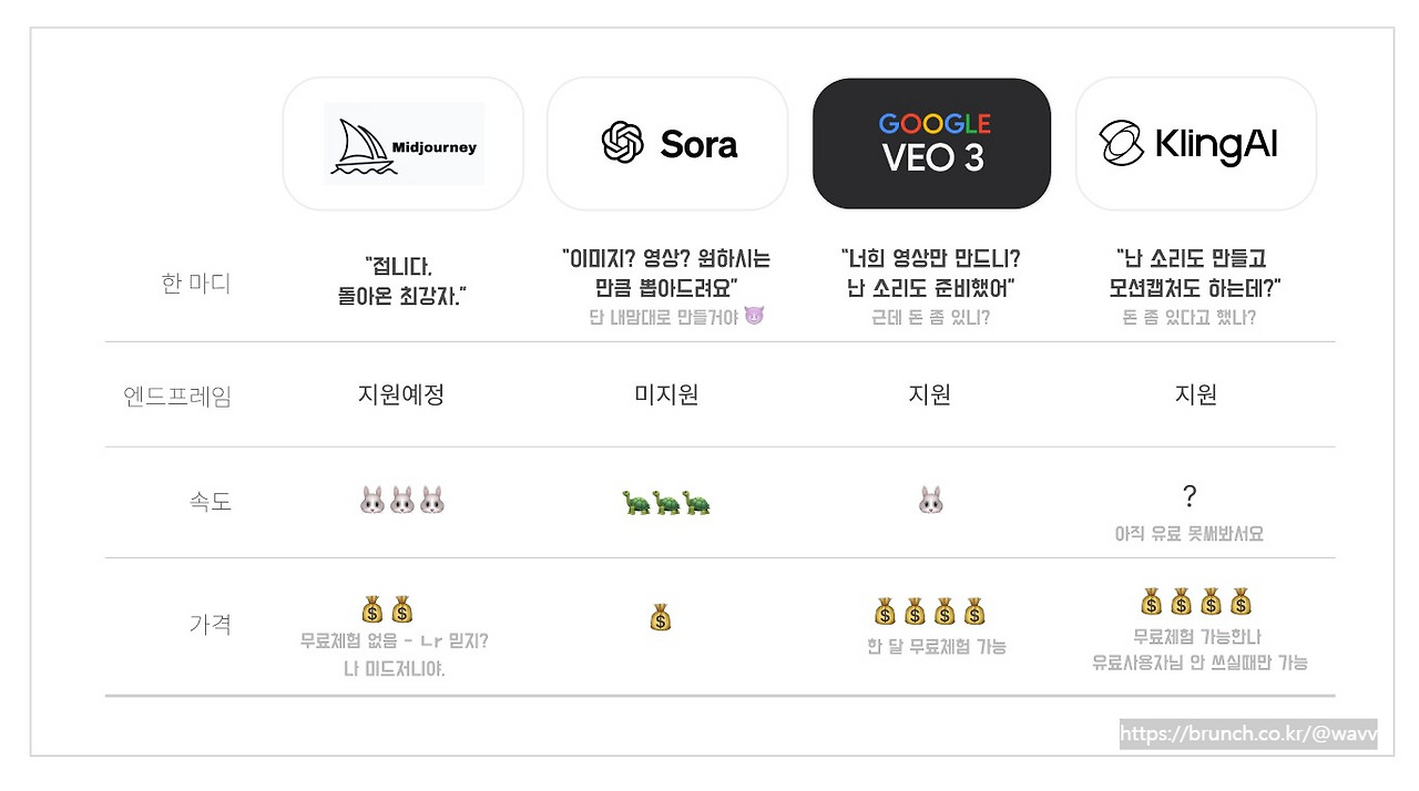 이 글을 쓰는 2025. 7. 10 현시점에서 가장 많이 회자되는 비디오 생성툴은 미드저니와 구글의 veo3로 보입니다. 그 외에도 Kling, Sora와 같은 툴들이 유명합니다. 이들의 장단점을 비교하고 툴 선택에 대한 활용팁을 드리겠습니다. (이번 글에서 다루지 못했으나 런웨이 Gen4 역시 상당히 높은 퀄리티를 갖추고 있습니다.)