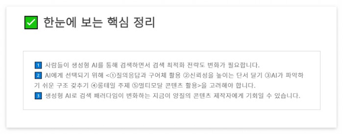 1️⃣ 사람들이 생성형 AI를 통해 검색하면서 검색 최적화 전략도 변화가 필요합니다. 2️⃣ AI에게 선택되기 위해 <①질의응답과 구어체 활용 ②신뢰성을 높이는 단서 달기 ③AI가 파악하기 쉬운 구조 갖추기 ④롱테일 주제 ⑤멀티모달 콘텐츠 활용>을 고려해야 합니다. 3️⃣ 생성형 AI로 검색 패러다임이 변화하는 지금이 양질의 콘텐츠 제작자에게 기회일 수 있습니다.