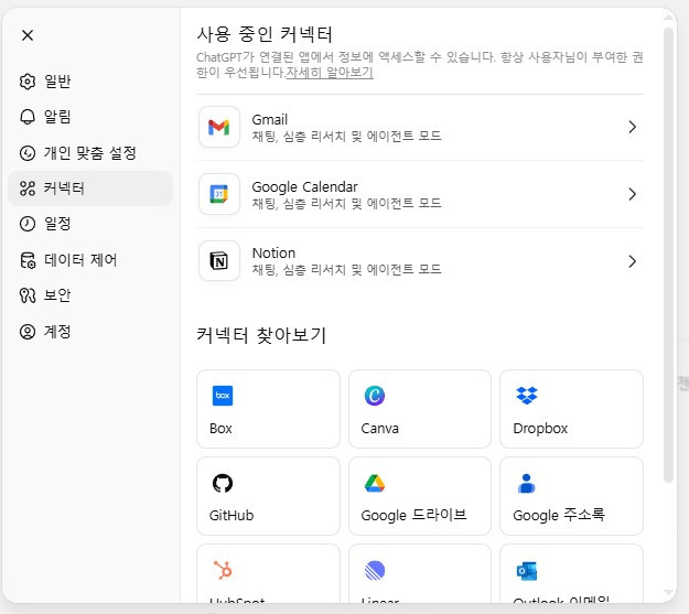 커넥터가 예상보다 빨리 출시되었다고 생각했는데, 역시나 안정화 측면에서는 아직 시간이 더 필요해 보입니다. 그럼에도 불구하고 커넥터 업데이트 이후에 여기에 등록된 기존 서비스들을 더 적극적으로 써야겠다는 생각이 들었어요. 챗 GPT의 활용도를 높이려면, 우선 구글 드라이브에 여러 가지 재료들이 갖춰져 있어야 하니까요. 커넥터가 크게 이슈화되지 않았지만 챗 GPT 에이전트는 플랫폼으로서 조용히 한 발 성큼 내디딘 것으로 보입니다.