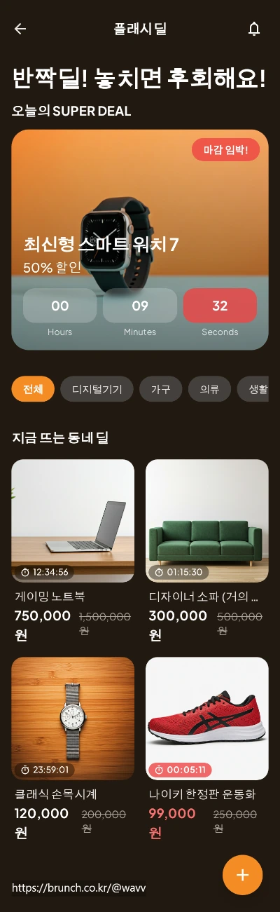판매자가 특정 시간 동안만 경매를 진행하거나 파격적 한린 가격으로 물품을 판매할 수 있는 기능입니다. 구매자는 실시간으로 입찰하거나 빠르게 구매를 결정해야 합니다. 긴박감과 흥미를 불러일으키기 좋아 보였습니다.