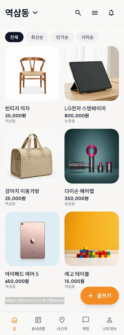 프롬프트 창 앞에서 고민하다가 입력한 것은 ‘동네에서 하는 중고거래 디자인‘이었습니다. 저의 요즘 최애 서비스 그 당근을 떠올리면서 입력한 것이 맞습니다. 결과물을 보고 정말 깜짝 놀랐습니다.