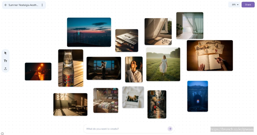 이 과정은 텍스트 → 이미지로의 연상할 때 드는 마찰을 줄여주어, 다양한 모티프들을 단시간에 빠르게 뽑아낼 수 있도록 도와줍니다. 다만, 공유 및 공동편집과 관련된 기능들은 아직 개발이 더 필요해 보입니다.