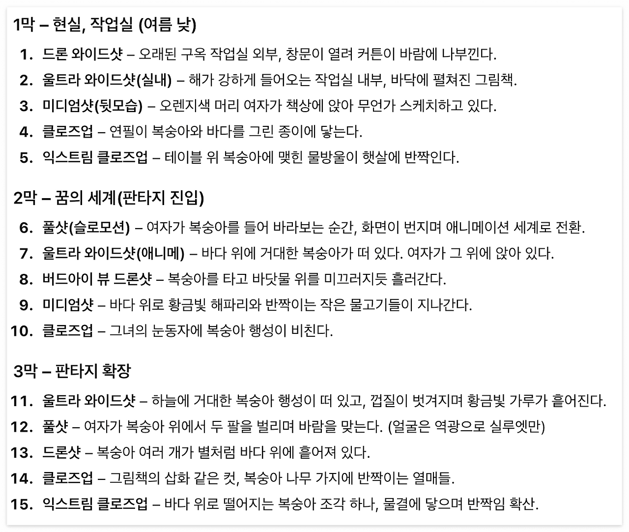 저는 각 씬마다 감정 단위를 ‘설렘, 신비함, 아쉬움’ 이런 식으로 쪼개서 정리를 했는데요. 이렇게 감정을 먼저 쪼개놓으면, 카메라·배경·소품·캐릭터 표정까지 모두 그 감정 하나를 밀어주는 방향으로 정리할 수 있습니다.