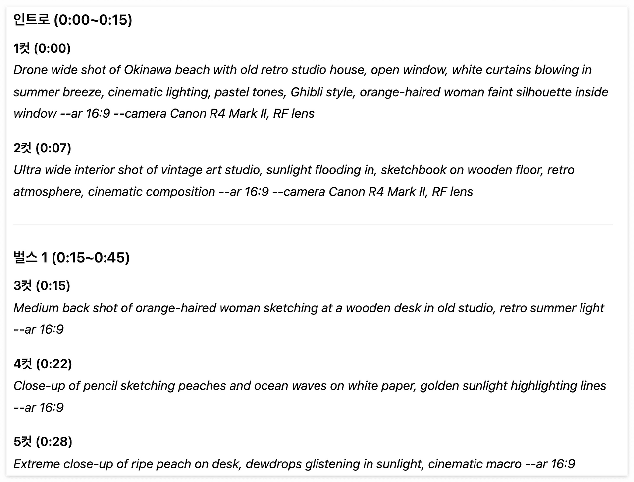 “3분짜리 뮤직비디오를 만들 거야. 메인 감정은 ‘첫사랑 같은 여름의 끝, 약간의 상실감’이고, 세계관은 ‘구운몽’처럼 꿈과 현실이 섞인 느낌이야. 씬을 크게 3막으로 나눠서, 각 씬마다