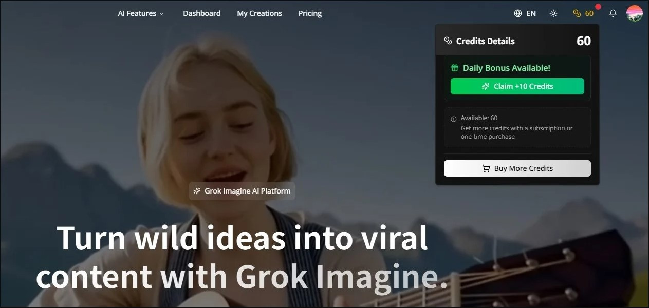 그록 이매진(Imagine 링크) 툴의 성능은 종종 미드저니보다 낫습니다 (저는 미드저니가 말 안 들을 때 그록 켭니다). 하지만 기본으로 주는 크레딧이 짜고 속도가 상대적으로 느립니다. 대신 매일 체크인을 하면 10크레딧을 주기 때문에 특히 영상제작이 급하지 않으신 분들은 이 점을 잘 활용하셔도 좋겠습니다.