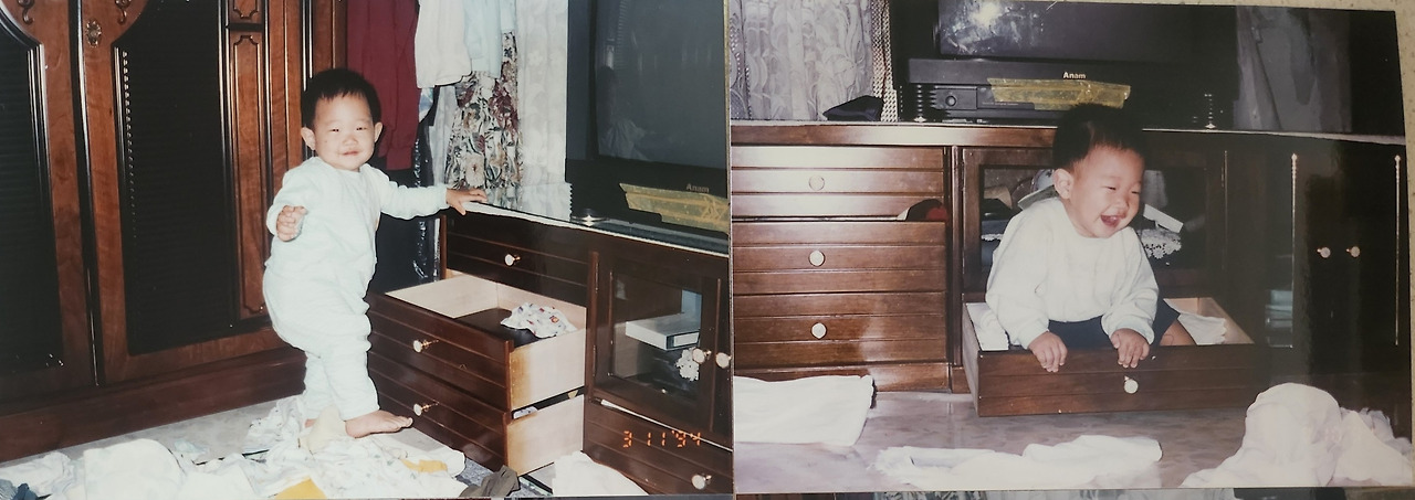 아들은 바로 옷장 서랍으로 향했고, 첫 번째 서랍 위에 올라가 나를 쳐다보며 미소를 지었다.