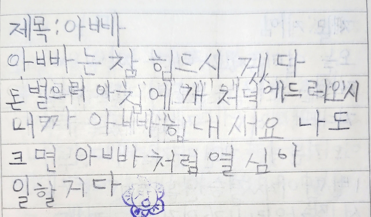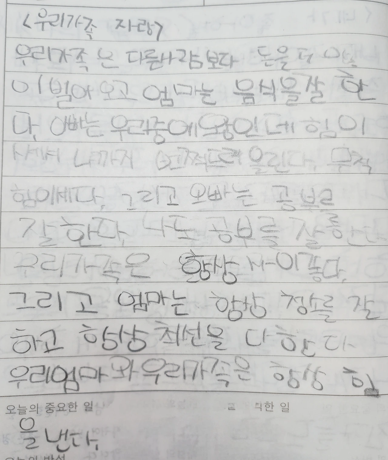 그런데 딸이 일기장 <우리 가족 자랑>에서 '우리 가족은 다른 사람보다 돈을 더 많이 벌어오고... 힘이 센 아빠, 공부 잘하는 오빠와 자신 그리고 항상 최선을 다하는 엄마와 우리 가족은 항상 힘을 낸다'는 일기를 읽으며 내가 보여주고 싶었던 부분, 내가 말을 해서가 아니라 우리 부부의 모습과 생활을 보며 아이들이 자라고 있었다는 것을 다시 한번 깨달았다.