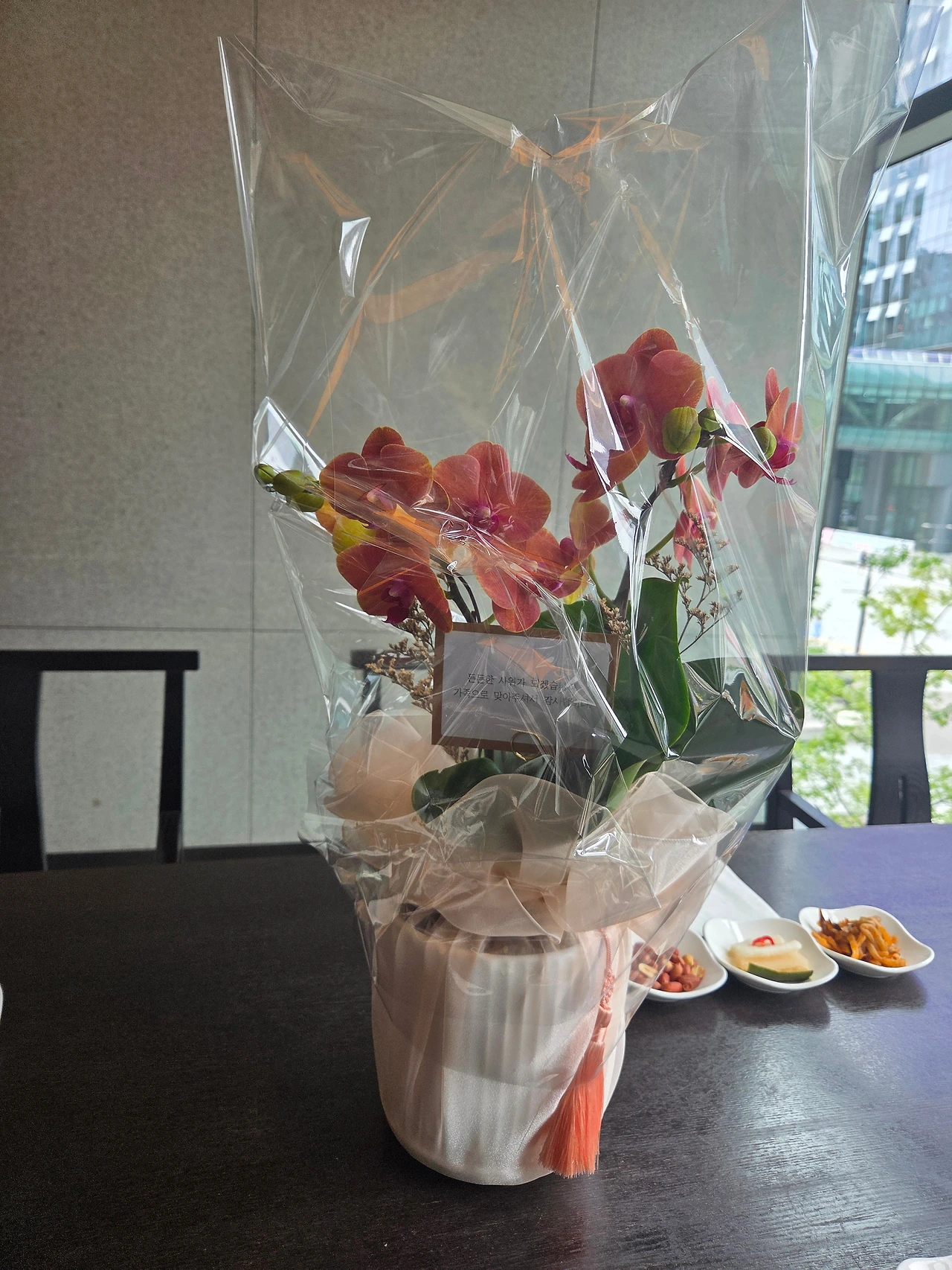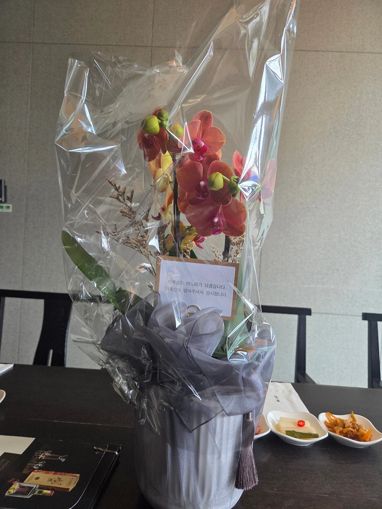 상견례 장소를 안내받아 들어가니 예쁜 난 화분이 우리를 반겼다. 예비 며느리의 정성과 노력이 보여 고마웠다.
