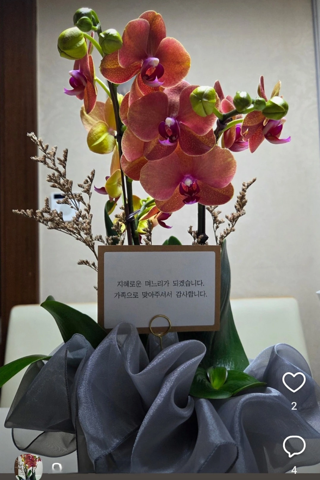 집에 와서 호접란을 예쁘게 찍어 내 카톡 프로필에 올렸다. 예비 며느리가 봤으면 하는 마음으로 '환영합니다'라는 글도 남겼다. 그랬더니 회사 동료분이 응원글을 남겨주셨다.