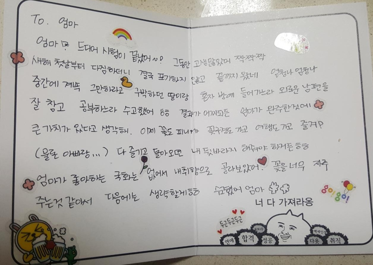 "결국 포기하지 않고 끝까지 왔네. 엄청나 엄청나! 결과가 어찌 되든 엄마가 완주한 것에 큰 가치가 있다고 생각해"라고 딸이 써준 글에 큰 감동을 받았다! 이거면 되었다.
