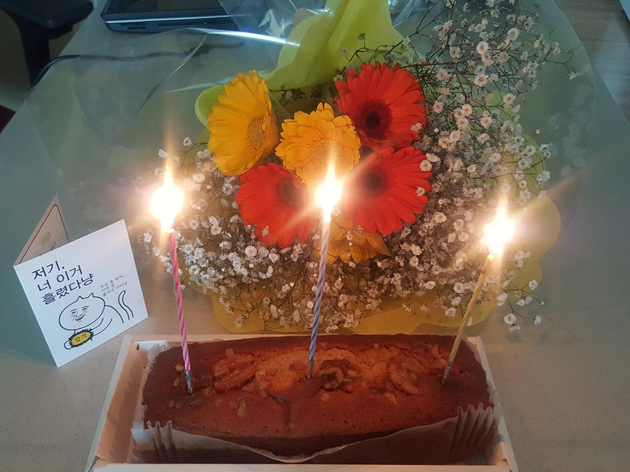 스스로에게 나름 고생했다, 노력했다고 토닥여주며 집에 도착했는데 딸이 꽃다발과 합격카드 그리고 파운드케이크를 준비해서 서프라이즈 파티를 해주었다.