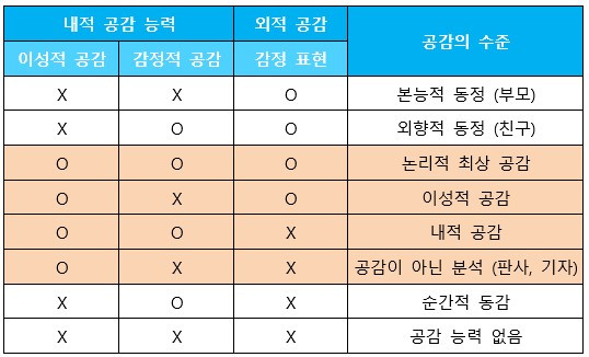 공감이라는 것을 세분화하면, 내적으로 진행하는 이성적 공감과 감성적 공감, 그리고 겉으로 표현하는 감정 표현이 있다.