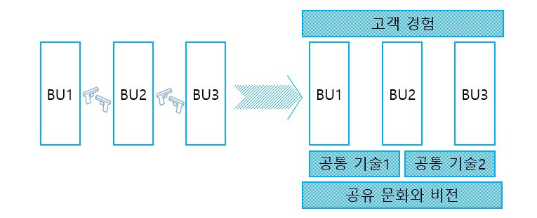 사업부들이 공통으로 의지할 수 있는 내부의 문화와 미래 플랫폼의 부재가 문제였을 것이다. 공유할 수 있는 공통된 문화를 차치하고서라도, 모든 사업부가 공동으로 의존하고 개발 하는 공동의 플랫폼(Horizontal Platform)이 급선무이다.