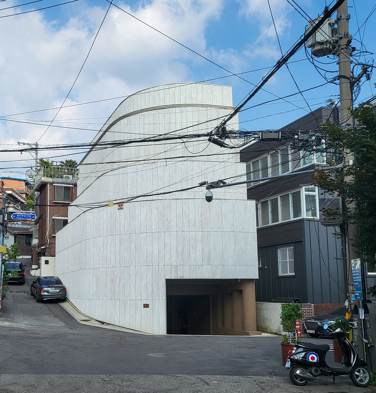유려하게 휘어진 덩어리들이 층층이 쌓여 있는 외관이 주변의 주택가 사이에서 시선을 확 사로잡습니다. 책을 콘텐츠로 한 공간인 만큼 거친 질감에 결이 촘촘한 하얀색 외장재를 사용하여 마치 책을 켜켜이 쌓아 놓은 듯한 형태를 구현했는데요.