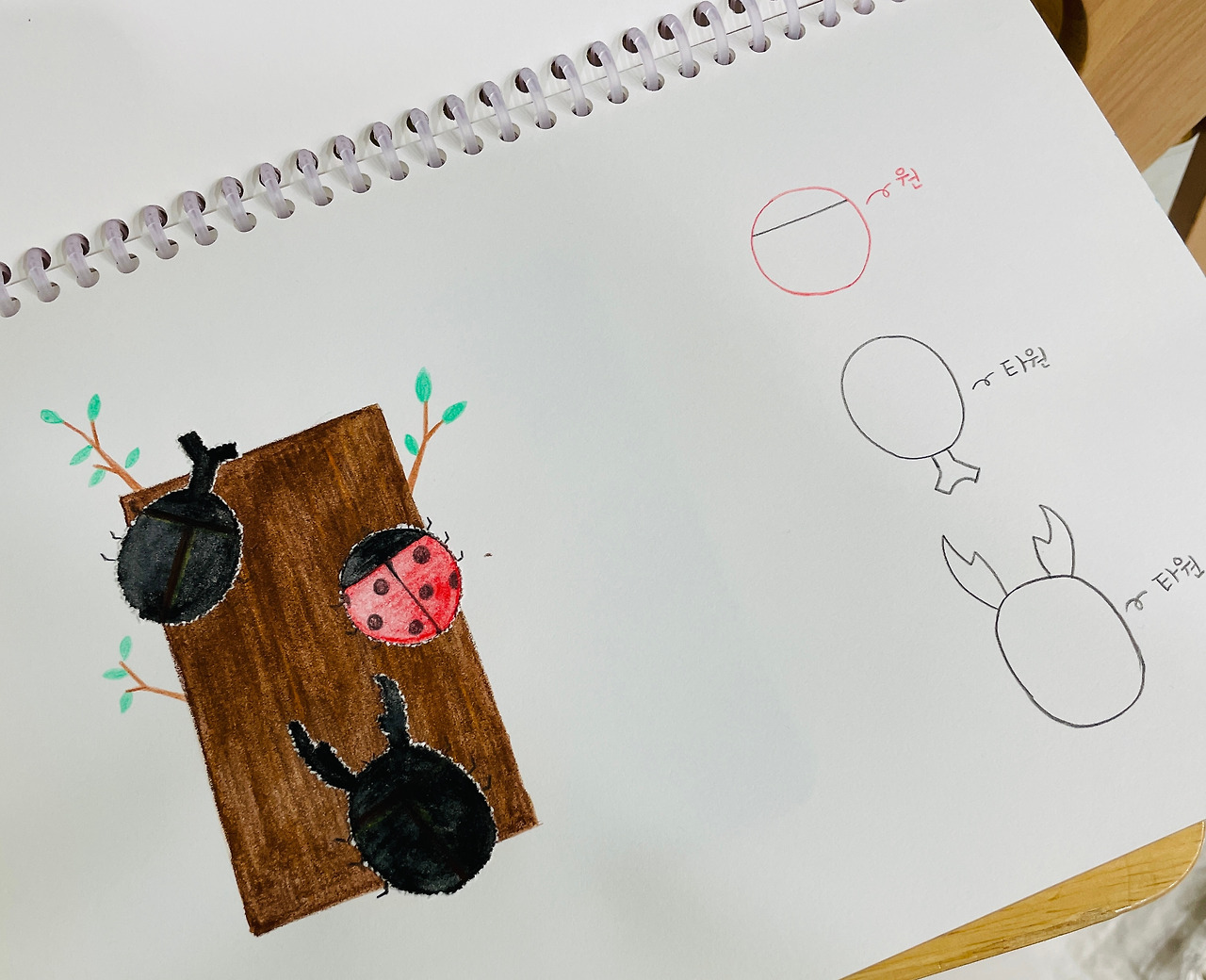 아이들과 그림을 그릴 때에 관찰력을 높여주는 좋은 방법이 있습니다. 도형의 이름을 알려주고 인식하는 것에서 출발을 합니다. '나무 위의 곤충들'은 원과 타원 그리기를 먼저 하고 확장된 활동으로 적용하면 좋습니다. 사물을 보고 그냥 그리라고 하면 아이가 막막해합니다. 그러나 사물을 보고 알고 있는 도형들을 떠올리면서 그리게 하면 보다 쉽고 관찰력도 좋아집니다. (자세한 방법은 별도의 브런치북으로 다룰 예정입니다.)