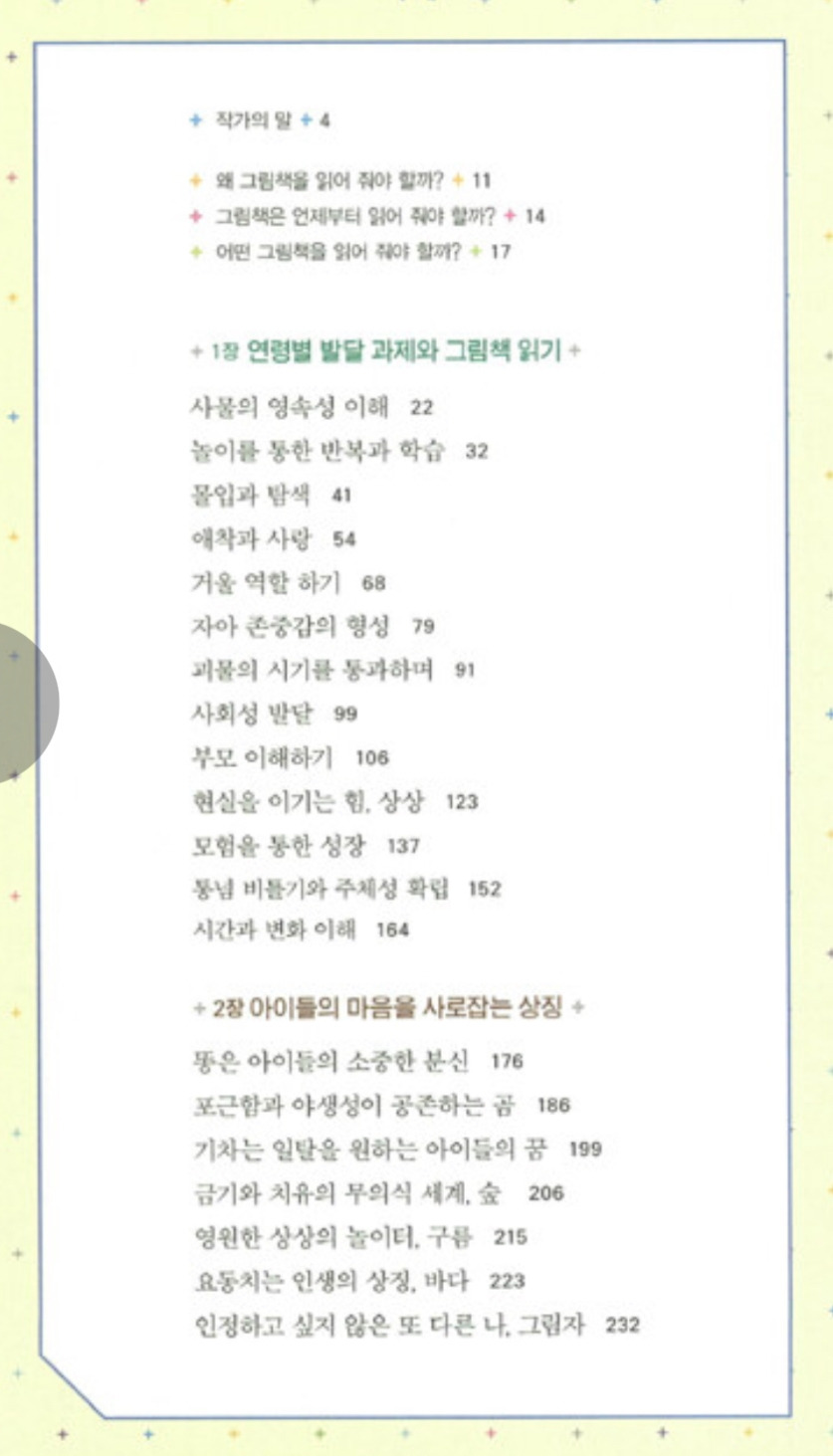 나는 아이들과 함께한 경험과 관찰을 바탕으로 한 이 책의 그림책 선택 기준이 퍽 마음에 든다. 이 책에 관심이 있으실 분들을 위해 목차를 첨부한다. 어떤 기준과 시각으로 그림책을 소개하는지 살짝 엿보시길 바란다.