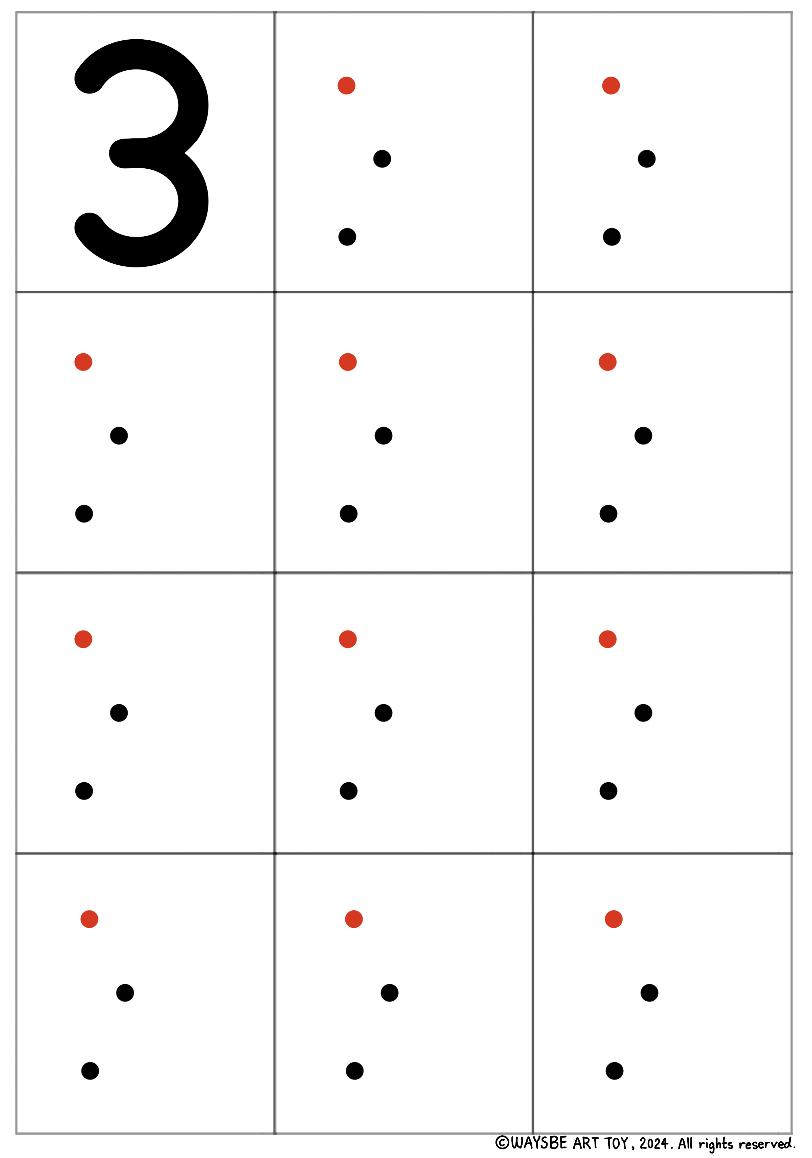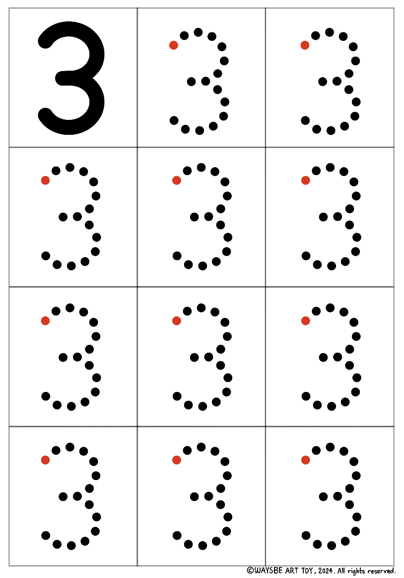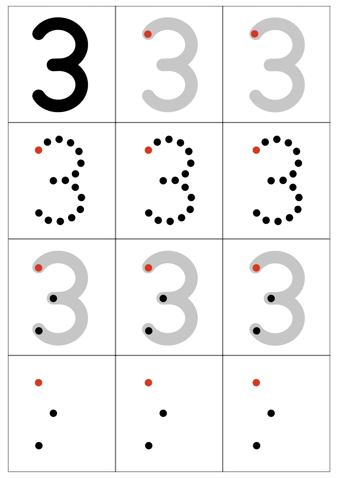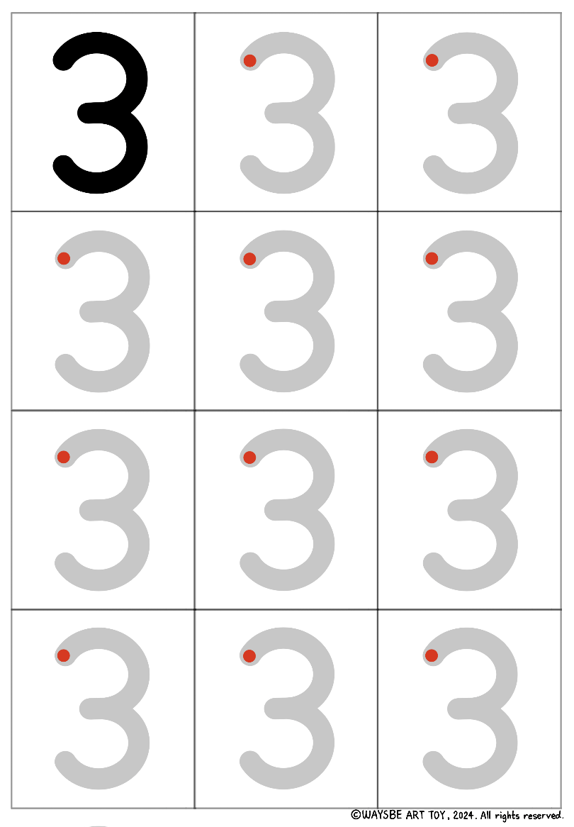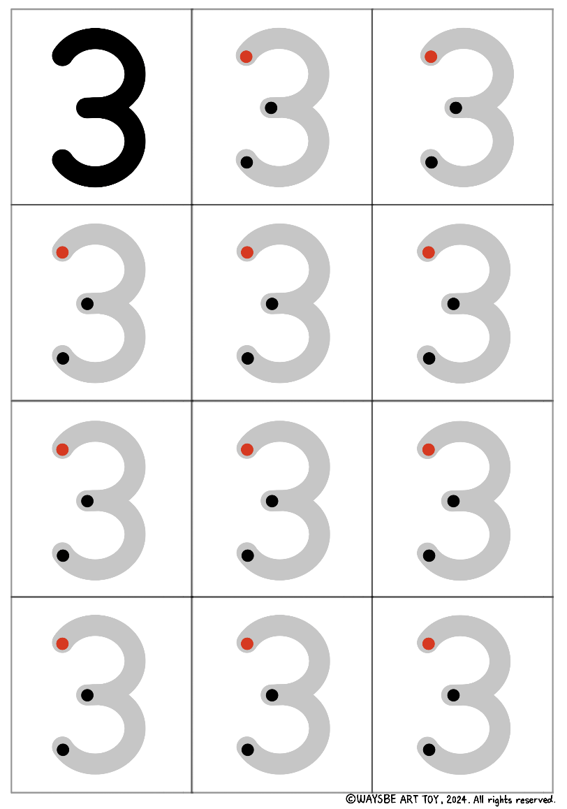 숫자 '3'을 예로 들겠습니다. '3'은 모양을 분석하면 호 두개로 이루어져 있지요. 빨간 점은 시작점입니다. 1단계에서 아이는 빨간점에서 시작하여 회색 선을 따라 3을 써보게 됩니다. 2단계에서 아이는 빨간점에서 시작하여 점과 점을 연결하며 3의 모양을 인식하며 씁니다. 3단계는 2단계보다 점이 많이 생략되었습니다. 그래서 인도가 필요합니다. 따라서 빨간점에서 시작하여 회색선을 따라 멈추는 점인 까만점까지 호 1개를 그리고 잠시 멈추었다가, 다시 호 1개를 더 그리며 끝점까지 이동합니다. 3단계와 1단계가 다른 점은 '멈추는 점'과 '끝점'을 인식하며 연습한다는 점입니다. 1단계에서는 회색선을 그냥 따라가며 숫자의 모양을 탐색했다면, 3단계에서는 그 숫자의 모양을 분석하여 두 개의 도형(호 2개)으로 이루어졌다는 것을 파악하고, 1,2단계처럼 천천히 따라 그리는 것이 아니라 호 2개를 1번 멈추면서 단번에 그려내야 합니다. 4단계에서는 3단계의 회색선이 사라지고 기준점 3개만 남습니다. 이 기준점을 호 2개로 연결하며 3을 그립니다. 마지막 5단계는 빈칸입니다. 스스로 시작점, 멈추는 점, 끝점을 생각하며 '3'을 씁니다.