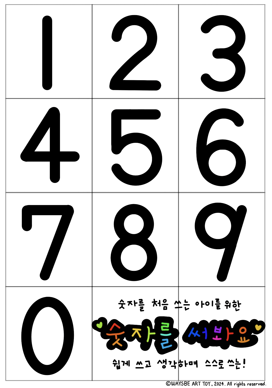 만 3세 아이들은 완벽하지는 않지만 수 개념이 어느 정도 있고, 숫자도 읽을 수 있어요. 통문자 읽기가 가능한 시기이기 때문에 만약 아직 못 읽는다 해도 조금만 연습하면 금새 숫자의 모양을 인지하여 읽습니다. 0-9까지의 수는 개수도 10개 밖에 되지 않아 만 3세 아이들이라면 금새 익힐 거예요.