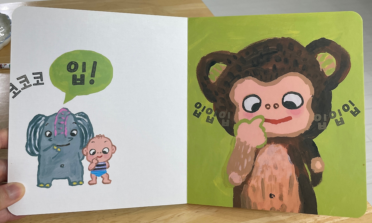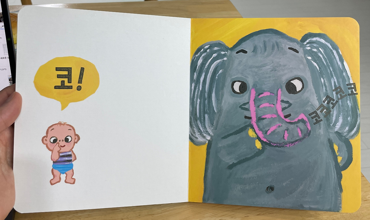 같은 그림책을 한 번 읽고 치우는 것이 아니다. 잊을 만 하면 꺼내놓고를 반복하면 개월수에 따라 완전히 다른 경험을 할 수 있다. 18개월 무렵에는 아이가 신체부위를 손으로만 짚을 수 있지만, 두 돌 무렵이 되면 짧고 귀여운 말투로 "눈!", "코!", "입!"이라고 말하며 책과 엄마의 얼굴을 가리키며 말한다. 요즘 22개월이 된 딸이 하는 행동이다. 너무 귀엽다!