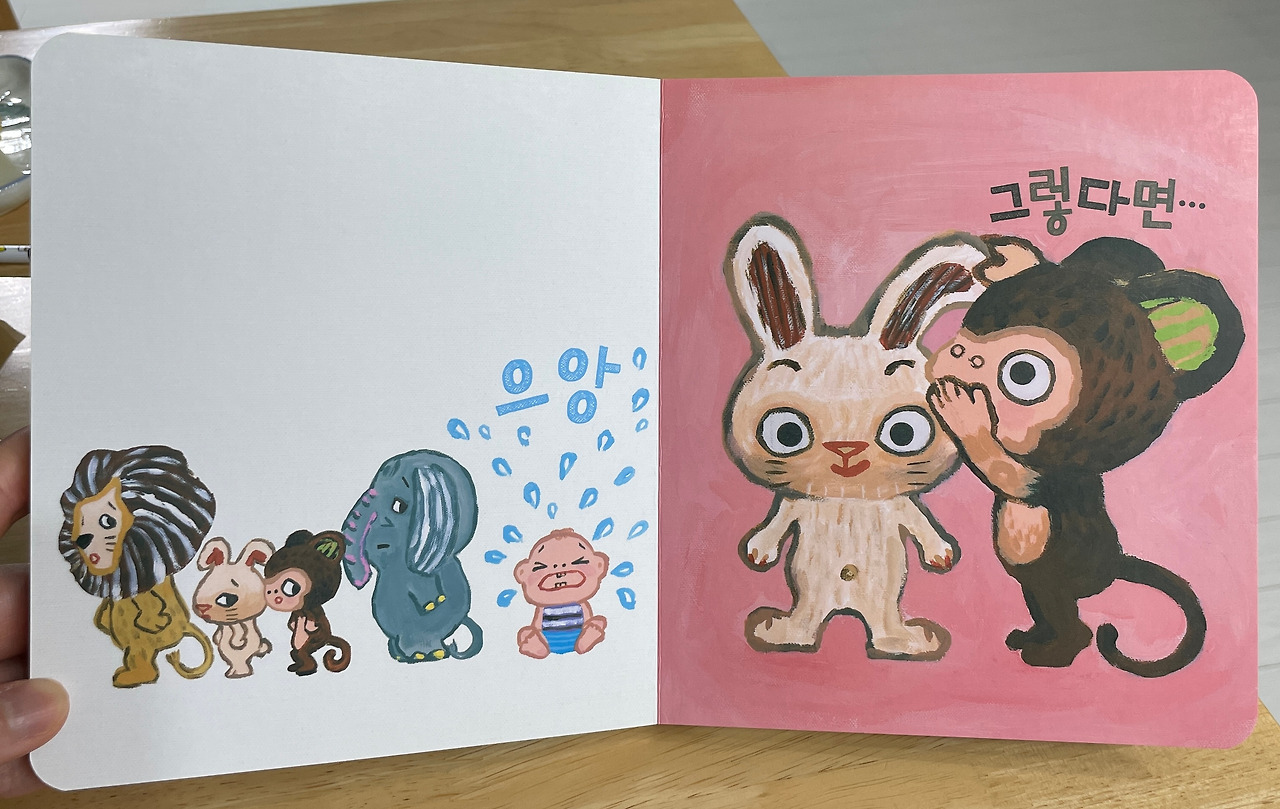 첫번째 재미 요소는 '꼬리'이다. 다른 동물들은 모두 꼬리가 있는데, 아기만 꼬리가 없다. 아기의 표정이 울상이다.