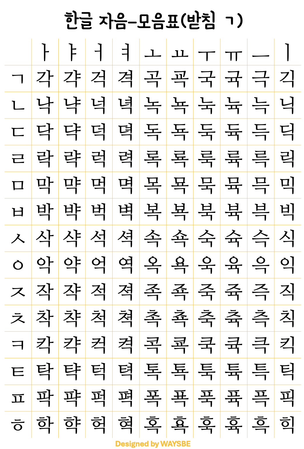 받침 소리의 대표 음가 7개(ㄱ,ㄴ,ㄷ,ㄹ,ㅁ,ㅂ,ㅇ)를 받침자리에 넣어서 표로 만들었습니다. 한글 파닉스를 공부할 때, 받침 소리 읽기 연습을 할 때 활용하실 수 있습니다.