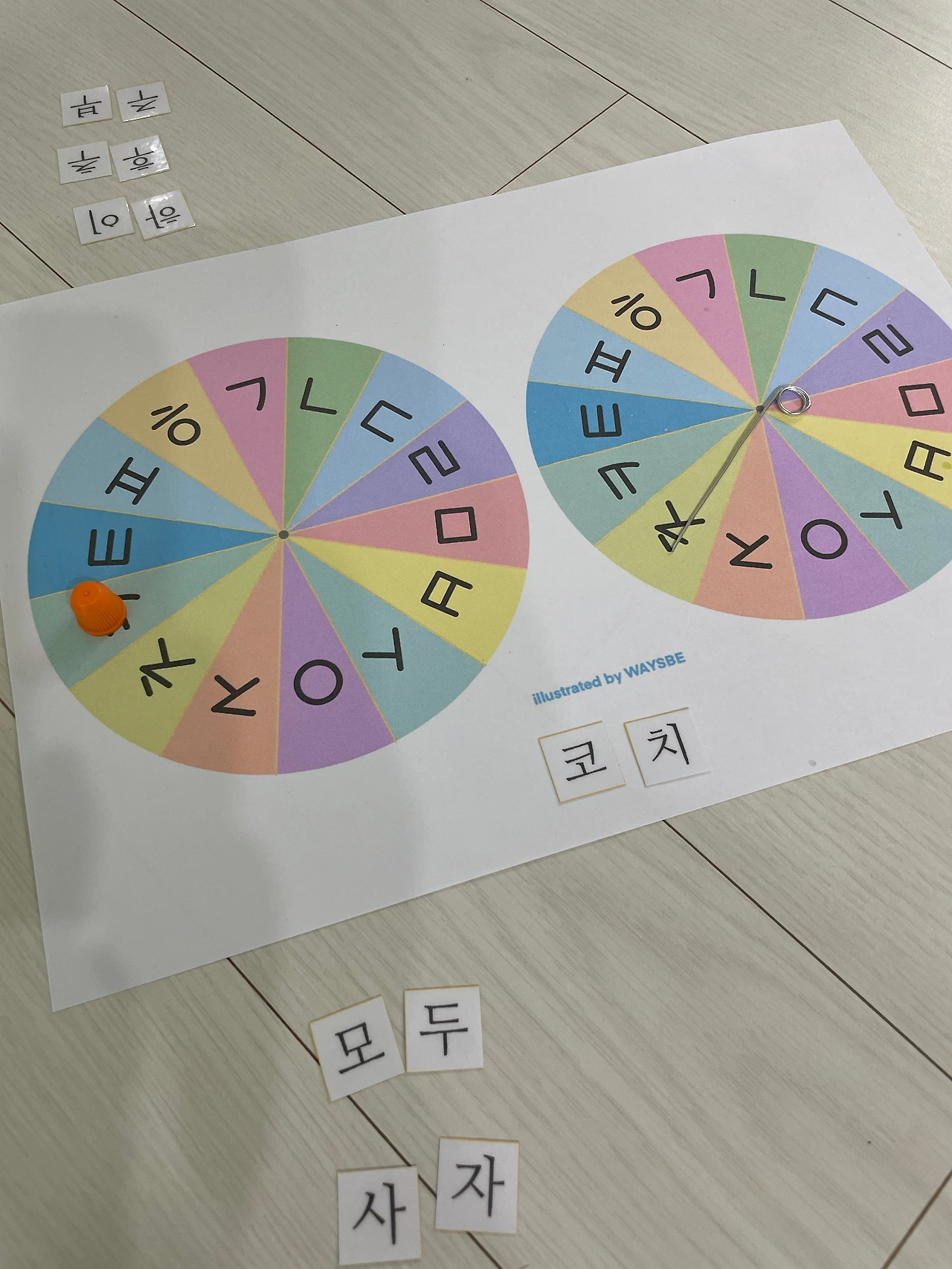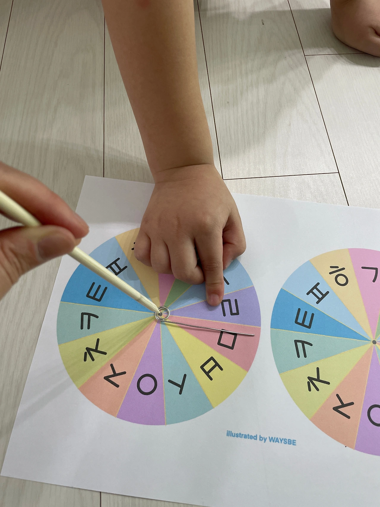 초성 단어 만들기 게임을 할 때 사용할 수 있어요. 그대로 뽑으셔서 연필과 클립을 사용하여 룰렛으로 활용하실 수 있습니다. 클립 한쪽을 펴신 후, 룰렛의 중앙에 연필로 고정을 하고 돌리셔서 나오는 자음이 들어가도록 단어를 구성하면 됩니다. (생각보다 잘 돌아갑니다!) 곧 만 5세가 되는 아들과 해보니, 초성 두 글자는 해볼만 합니다. 룰렛을 두 번 돌려 ㅅ과 ㅈ이 나오면, "사자"라고 잘 찾습니다.