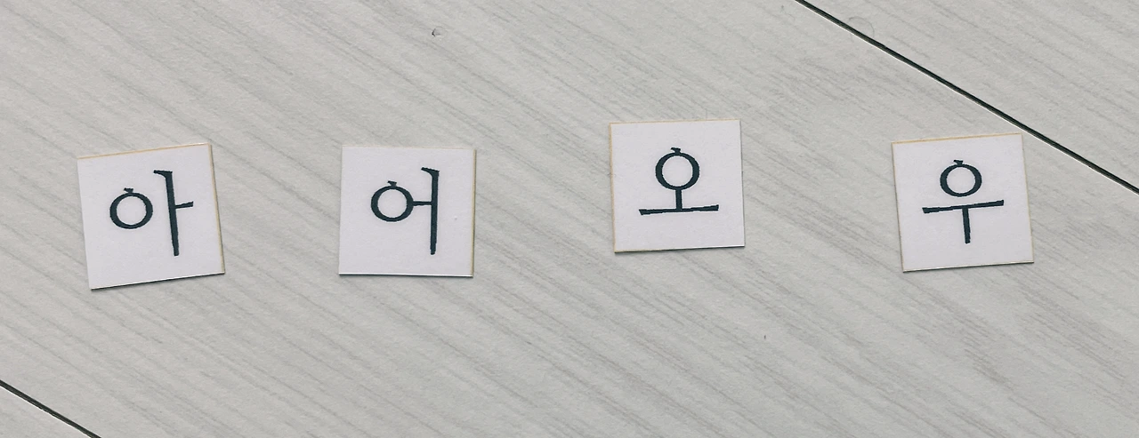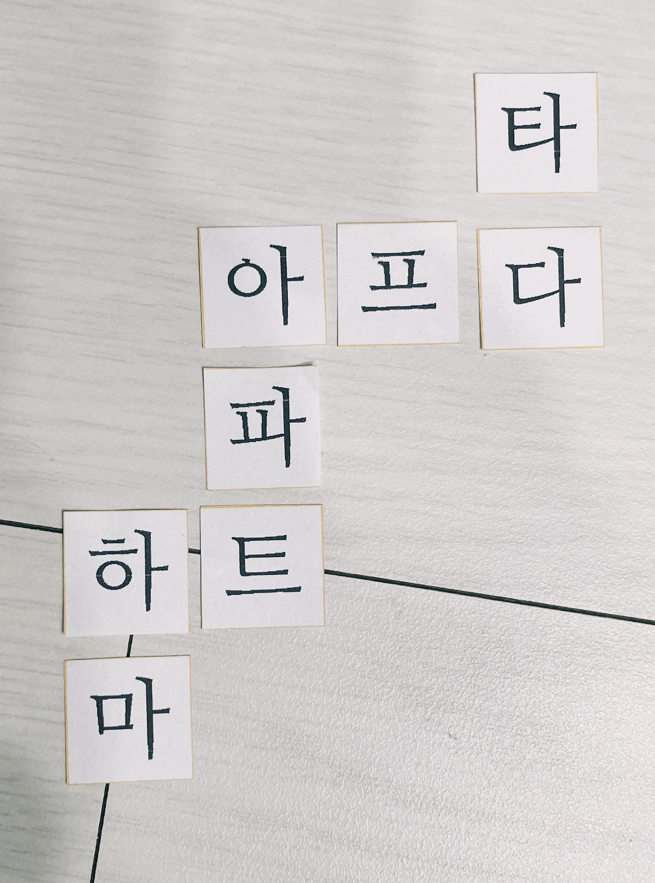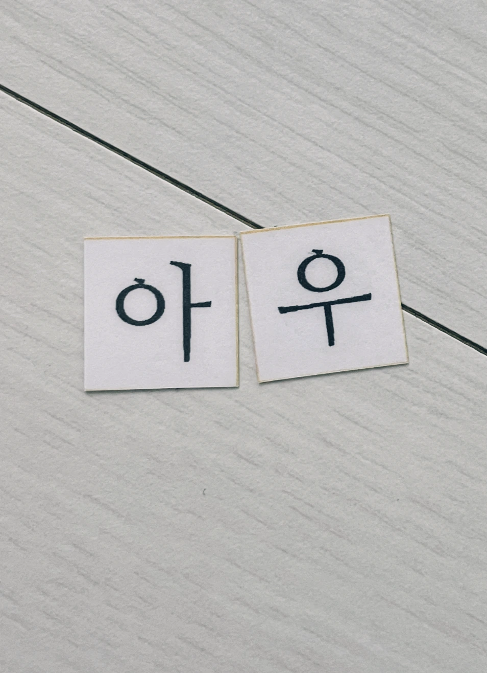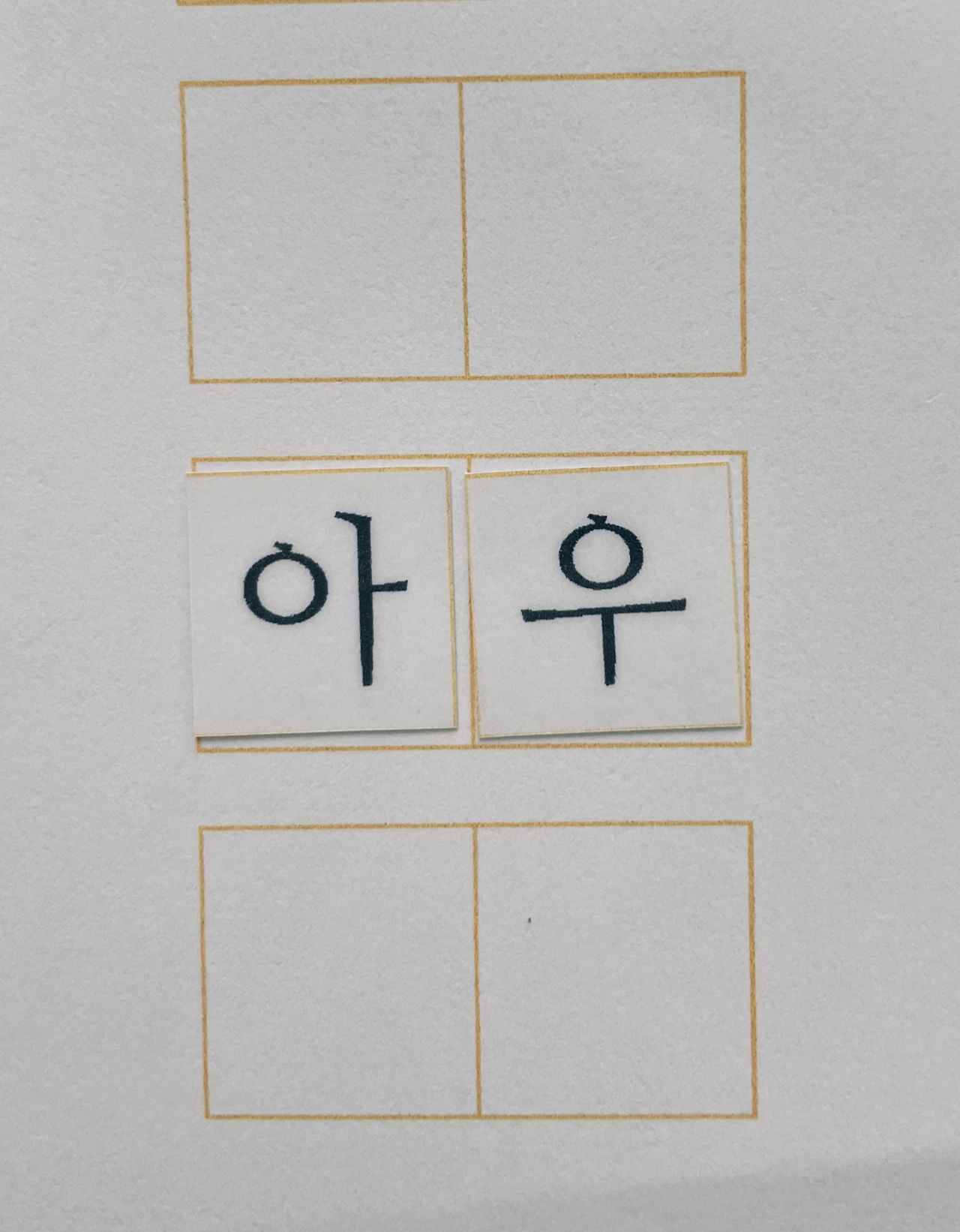 한글 파닉스를 하면서 배운 부분의 단어들을 잘라 단어 구성을 하고, 단어 만들기 학습지에 붙일 수 있게 구성하였습니다. 예시는 다음과 같아요. '아, 어, 오, 우'를 배운 날을 예로 들면, 한글 자음-모음표에서 해당 글자를 잘라 랜덤으로 읽기 연습을 먼저 합니다.