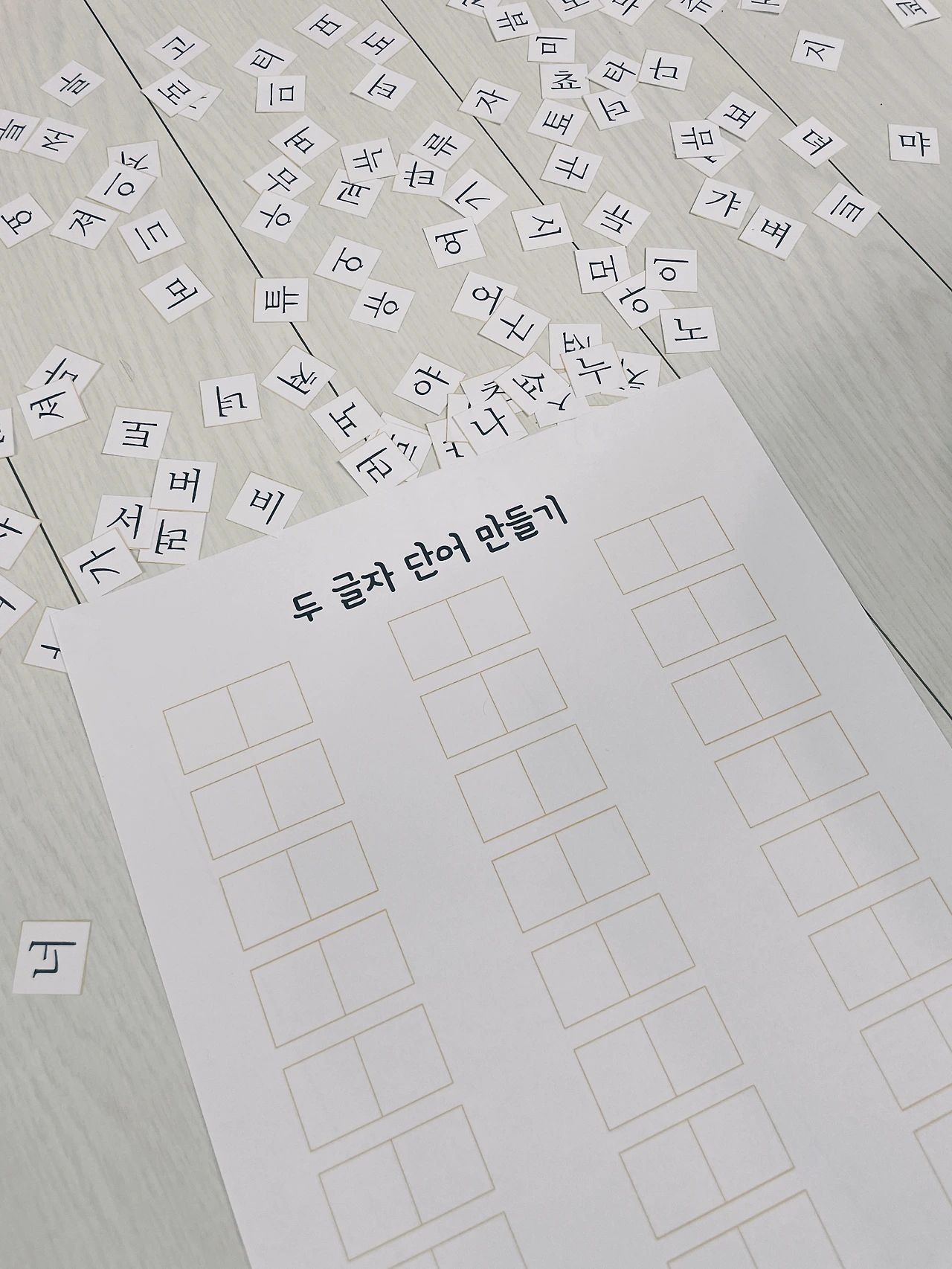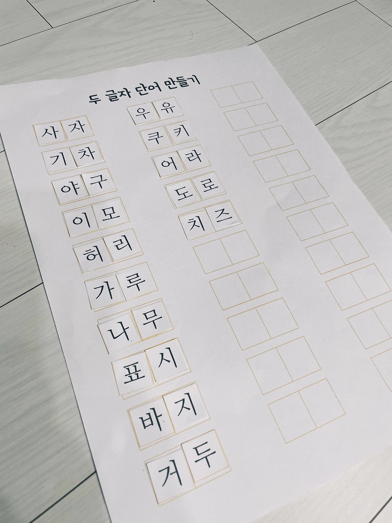 위에 아들이 활용한 학습지는 두 글자 단어 만들기 학습지인데요, 세 글자, 네 글자도 붙일 수 있도록 칸을 구성하여 만들었습니다.