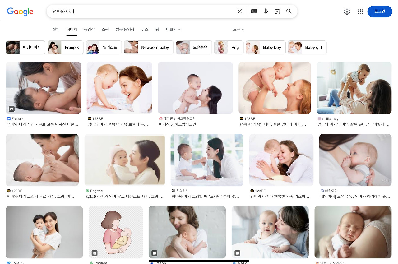 이 글을 쓰면서 즉흥적으로 구글 이미지에서 ‘엄마와 아기’라는 키워드를 넣어 검색해 보았습니다. 역시, 우리의 상상을 벗어나지 않는 그림들이 뜨네요.