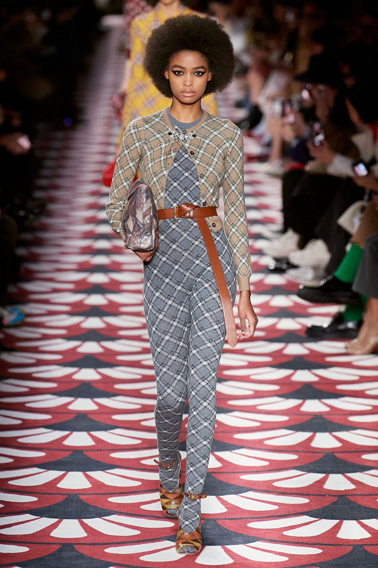 쇼의 중반부는 우아함의 상징인 체크 패턴에 대한 이야기였다. 고전적 체크 패턴은 반항적인 보석 장식, 의도적으로 미스-매치된 듯한 리본 장식과 함께 변주된다. 체크에 대한 변주는 더욱 대담해져 몸에 달라붙는 섹시한 체크 보디수트와 카디건의 매치로 이어진다. 우아한 캣 우먼! 미우치아는 한 번 더 묻는다. “이 대담한 캣 우먼들은 고전적 미우미우 여성만큼이나 우아하지 않은가?” 미우치아 여사의 이런 물음 앞에서 우아함에 대한 고정적 정의는 모호해져 갔다.