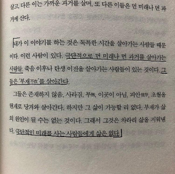그 이유는 참 장황하다. 내가 현재를 살아가지 않고 극단적인 미래, 부재(不在)를 살아가는 사람이기 때문에.