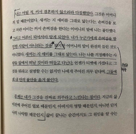 비겁한, 어쩌면 당연한 변명을 하자면 이건 -텍스트 상에 나타나는 단어를 사용하여- '아버지의 영향'과 '나의 나약함'의 복합적인 문제이기 때문에 어느 한 문제의 영역인지 경계를 구분 짓기가 어렵다는 것.