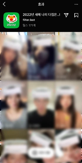 실제 브랜드 데이터를 공개할 수는 없으니 저희 팀에서 만든 필터를 예시로 설명드릴게요. 요 필터는 2022년을 맞이하여 제작한 신년맞이 새해다짐 필터입니다. 당시 해외에서 인기를 끌고 있던 영문 필터였는데요, 국내 유저들을 위해 저희가 빠르게 한국어 버전으로 만들어보았죠. 실제로 다들 한쿡말을 기다리고 계셨던 건지, 반응이 매우 좋았답니다 :)