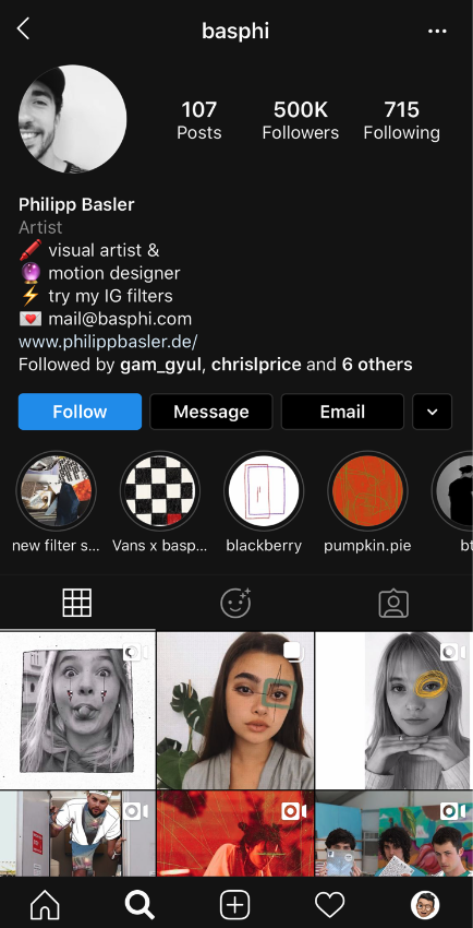 : 필터를 게재할 때 유명한 필터 리뷰어들을 태그하면 이들이 자신의 스토리로 공유해줍니다. 임의의 유저에게 직접 만든 필터가 노출될 수 있습니다. 운이 좋다면 하루에 수백 명의 팔로워를 얻을 수도 있습니다. 물론 그렇게 되려면 필터 자체가 트렌디하거나, 정말 예쁘게 얼굴을 바꿔주는 등 확실한 이점이 있어야 합니다.