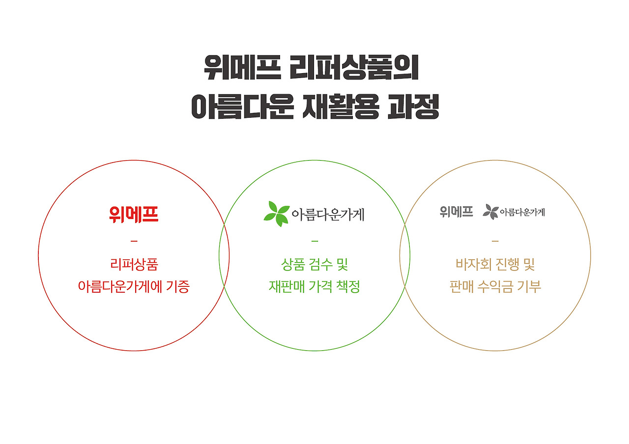 PS. 오는 3월 27일 아름다운가게 강동구청역점, 방학점, 분당이매점에서 ‘위메프 리퍼데이 특별전’이 열릴 예정입니다. 해당 지역주민 가운데 선순환 나눔 캠페인에 동참하고 싶은 분들이라면 참고 부탁드립니다. 코로나 19로 어려움을 겪고 있는 지역사회에 작은 도움이 되기를 기원합니다.