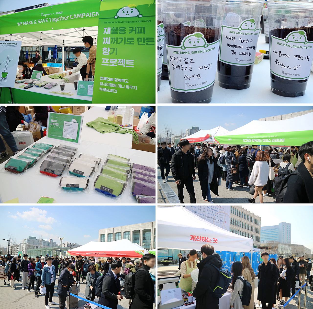 무엇보다 캠퍼스 리퍼데이는 각 학교의 봉사 단체나 환경 동아리, 홍보대사 소속의 학생들이 자원봉사자로 참여하면서 함께 만든 행사라는 점이 의미 깊습니다. 특히 작년 3월 연세대 환경 동아리 ‘연그린’과 함께 개최한 캠퍼스 리퍼데이에선 ‘WE MAKE & SAVE TOGETHER’라는 메인 슬로건 하에 환경 캠페인을 진행해 호응을 얻었는데요. 리퍼상품 바자회뿐 아니라 위메프카페에서 사용한 커피 원두와 일회용 플라스틱 컵을 재활용해 연그린의 대표 활동인 ‘재찌향’(재활용 커피 찌꺼기로 만든 향기) 방향제를 만들어 보는 등 풍성한 이벤트가 더해졌습니다. 이날 사용한 현수막도 모두 이후 업사이클 프로젝트에 사용될 수 있도록 연그린에 전달됐습니다.