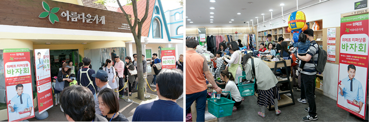 첫 리퍼데이는 2017년 4월, 아름다운가게 서울랜드 매장에서 ‘위메프 리퍼상품 바자회’라는 이름으로 열렸는데요. 미리 만들어 둔 대기표를 배부해 그룹 별 쇼핑 시간을 나누고, 따로 유모차를 보관할 수 있는 장소를 제공하는 등 고객의 동선과 상품 디스플레이, 홍보물 설치 위치 등을 꼼꼼하게 사전 준비한 덕분에 많은 고객 분들이 줄을 서고 기다려도 만족스럽다는 칭찬을 아끼지 않았습니다. 물론 ‘좋은 물건을 합리적인 가격에 사는 것’ 더불어 ‘구매만으로 기부할 수 있다는 것’에 대한 기쁨도 컸지요.