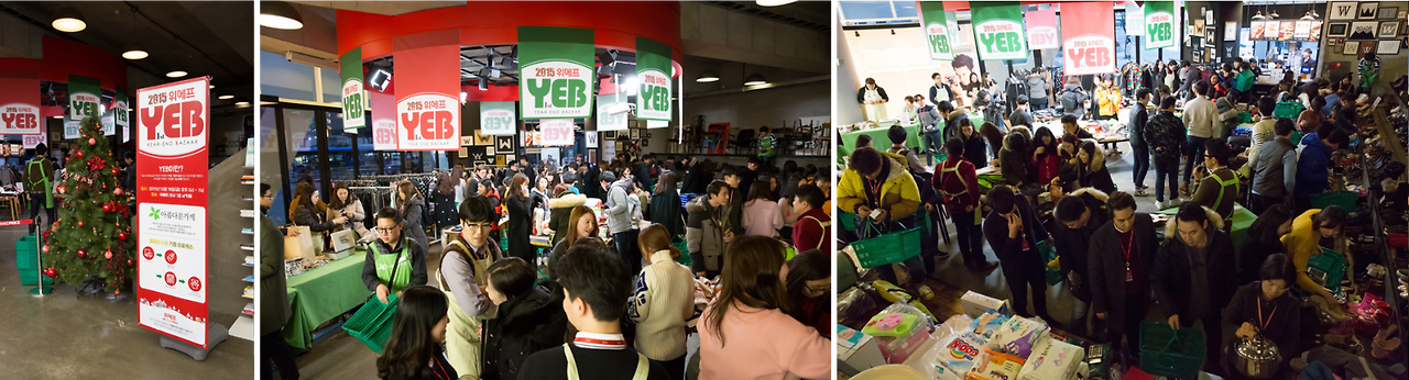 시작은 위메프 임직원들을 대상으로 한 사내 바자회였습니다. 2015년과 2016년 2년간 ‘YEB(Year-end Bazaar)’이라는 이름으로 본사 1층 위메프카페에서 리퍼상품뿐 아니라 임직원 개인 기부물품까지 더해 바자회를 열고, 연말 종무식을 대체했죠.