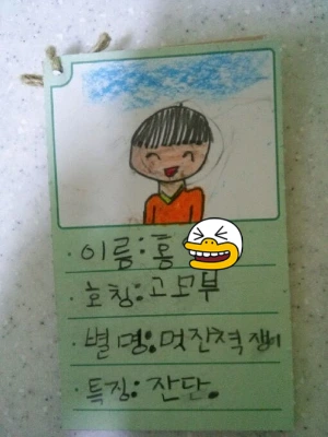 예전 사진을 뒤적이다 재미있는 사진을 찾았습니다. 어린 조카가 학교 과제로 제출한 이름표입니다. 아마 가족소개를 카드형태로 만들어 오라는 숙제였던 것 같습니다. 고모부는 물론 저를 말하겠지요. 별명은 '멋진쳑쟁이'고 특징이 '잔다'네요.