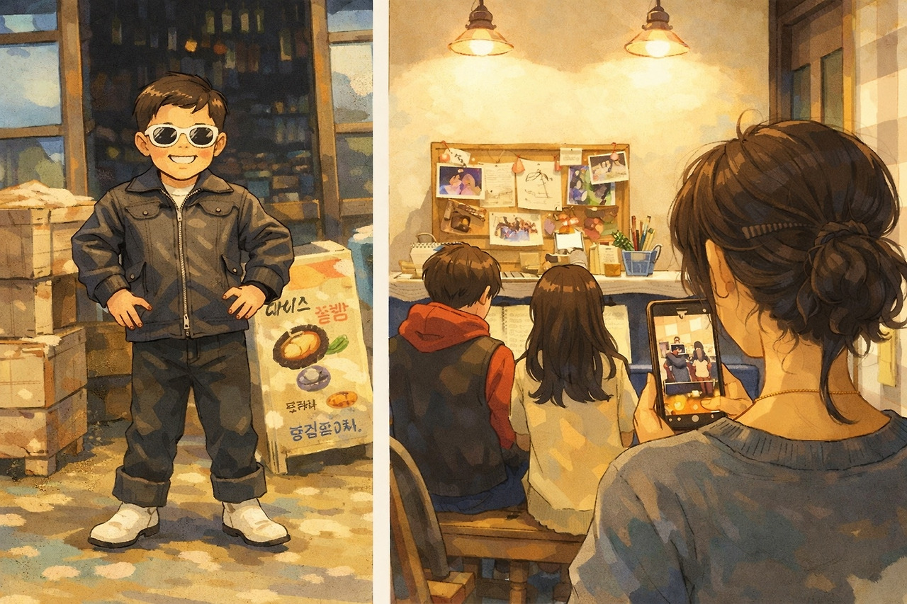 5살 때 우리 집은 서울에서 구멍가게를 했습니다. 입구에는 '아이스 꿀밤' 하드통이 하나 있었습니다. 노란색 고무튜브 속에 얼음과 소금을 채워 냉동기능을 갖도록 했죠. 가게 안으로 들어가는 통로에는 사탕이 담긴 유리 상자가 놓여있어서, 오가며 몇 개씩 꺼내 먹었던 기억이 납니다. 가죽잠바를 입고 장난감 플라스틱 안경에 하늘색 장화를 신고, 카메라 앞에서 멋지게 폼 잡고 찍은 사진이 그때를 추억하게 만듭니다.