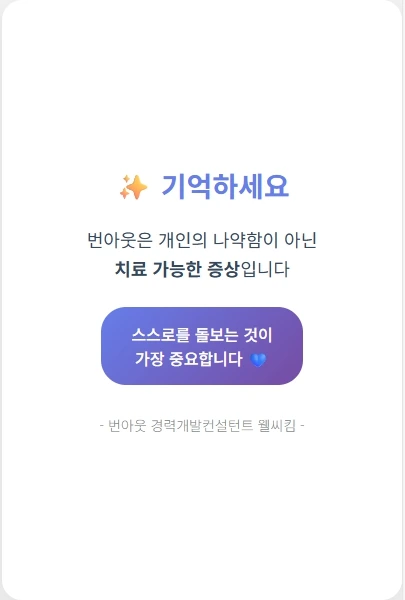 번아웃은 예방이 중요합니다. 자신에게 일어나는 변화를 알아차리는 것, 예방의 시작입니다^^