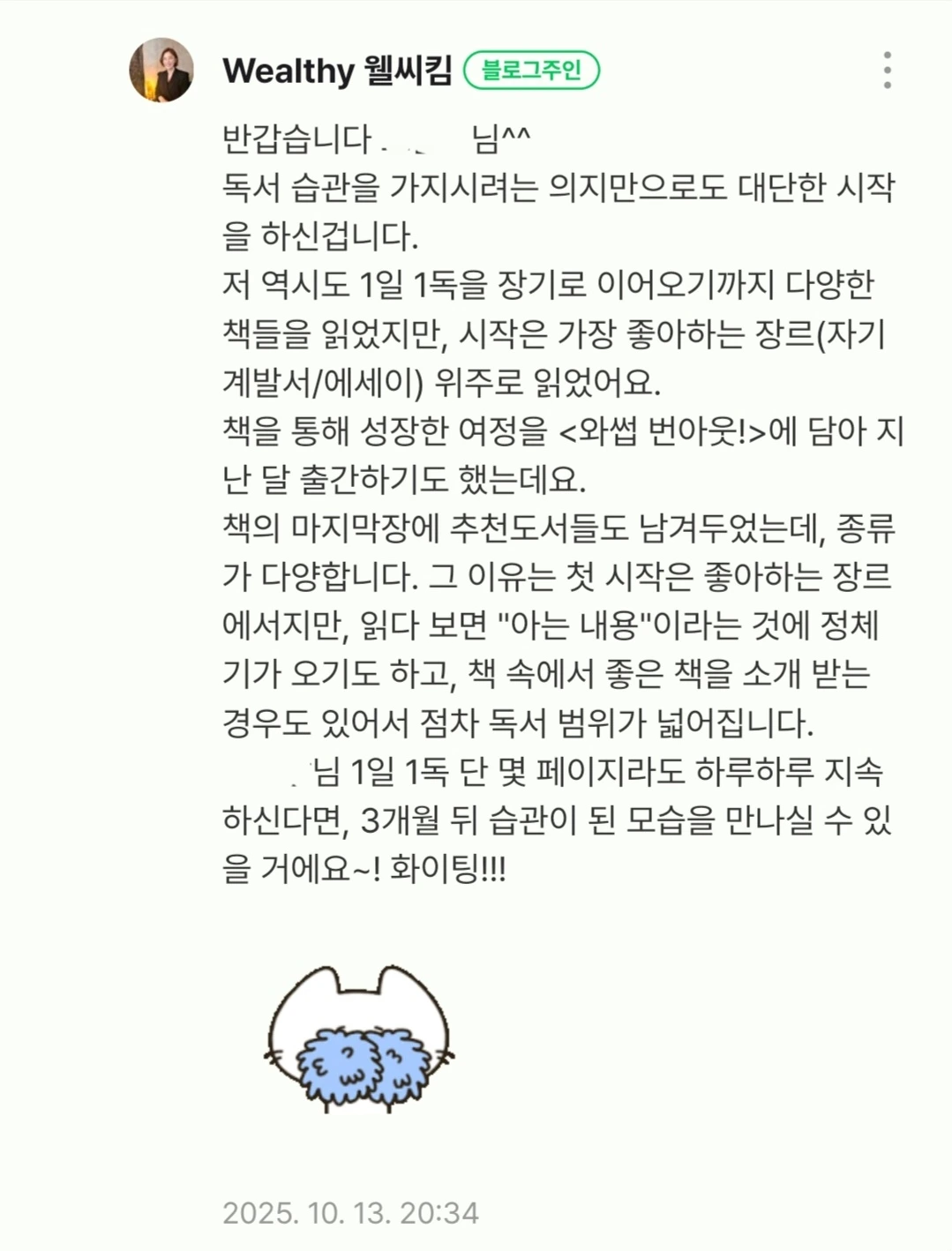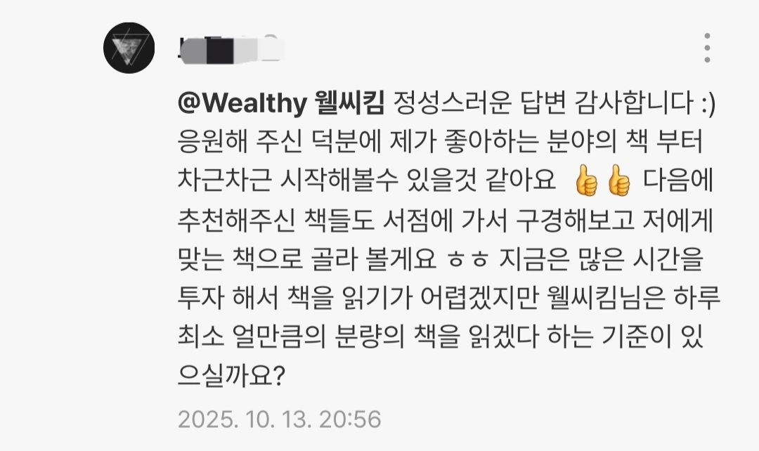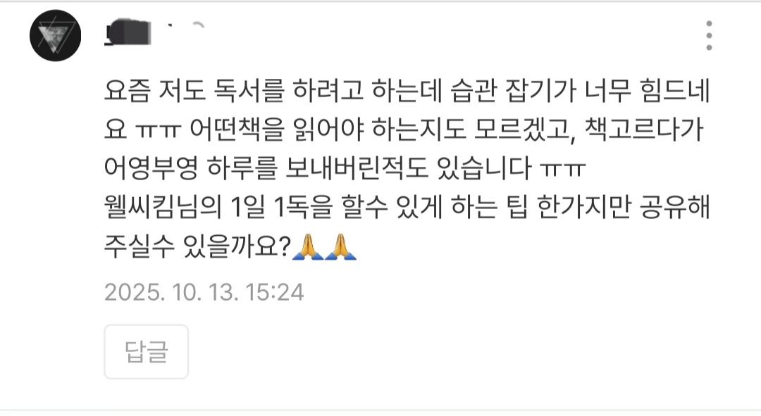 1일 1독 744일차독서를 습관화하는 방법이 궁금한 이웃분과의 Q&A가 있었습니다.개인의 취향이나 책의 특성에 따라 추천은 가능하지만, 가장 쉽게 실천할 수 있는 방법은 좋아하는 장르부터 조금씩이라도 매일 이어가는 것입니다!