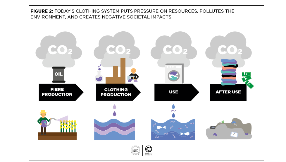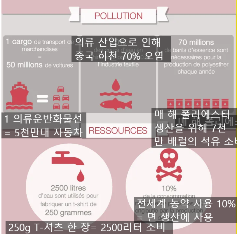 높은 수준의 이산화탄소를 배출하는 국제 항공 교통수단은 현재 전 세계 이산화탄소 배출량에서 2%-2.5%를 차지하는데 반해, 패션 산업은 8%-10%를 차지하고 있습니다. 석유 산업 다음으로 전 세계 가장 심한 환경오염을 가져오는 산업이 바로 '패션 산업'인 것입니다.