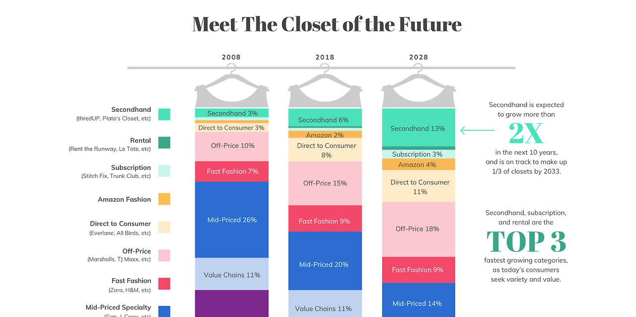 이렇게 의류 소비가 환경에 끼치는 영향이 커서, 서구 사회에서는 '의류 소비를 줄이자'라는 운동보다는 '#세컨드핸드 의류 소비'를 권장하고 있고, 실제로 세컨드핸드 매장이나 세컨드핸드 플랫폼의 매출이 매우 급속도로 높아지고 있습니다. 미국에서 발표된 자료에 따르면, 2028년엔 세컨드핸드 의류 시장이 #패스트패션 의류 시장을 앞지를 거랍니다.