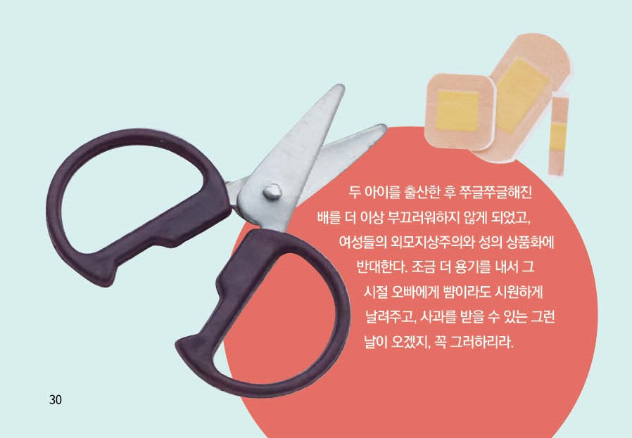내 인생의 하자 보수는 바로 여성주의 세계관을 갖게 된 것이다. 두 아이를 출산한 후 쭈글쭈글해진 배를 더 이 상 부끄러워하지 않게 되었고, 여성들의 외모지상주의와 성의 상품화에 반대한다. 조금 더 용기를 내서 그 시절 오빠에게 뺨이라도 시원하게 날려주고, 사과를 받을 수 있는 그런 날이 오겠지, 꼭 그러하리라.