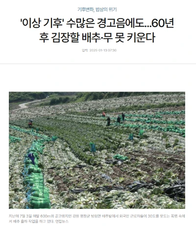 이성원(2025), '이상 기후' 수많은 경고음에도...60년 후 김장할 배추·무 못 키운다, 한국일보.검색해 보셨나요? '이상 기후'라는 단어를 쉽게 확인해 보실 수 있을 것입니다. 기후위기가 당장의 먹고사는 문제와 떼려야 뗄 수 없다는 사실은 자명합니다. 오죽하면 한국은행에서 작년에 '이상기후가 실물경제에 미치는 영향'이라는 보고서를 발간했겠습니까.